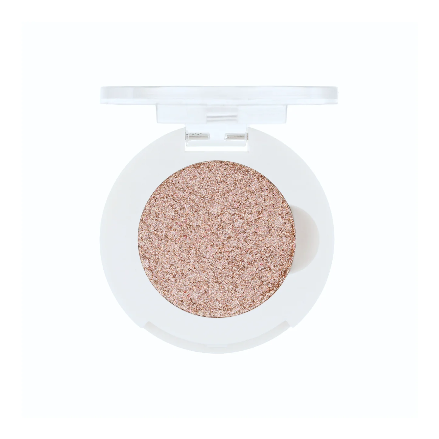 Lesklý očný tieň naplnený trblietavými, mikroskopicky jemnými časticami v odtieňoch ružovej a zlatej.