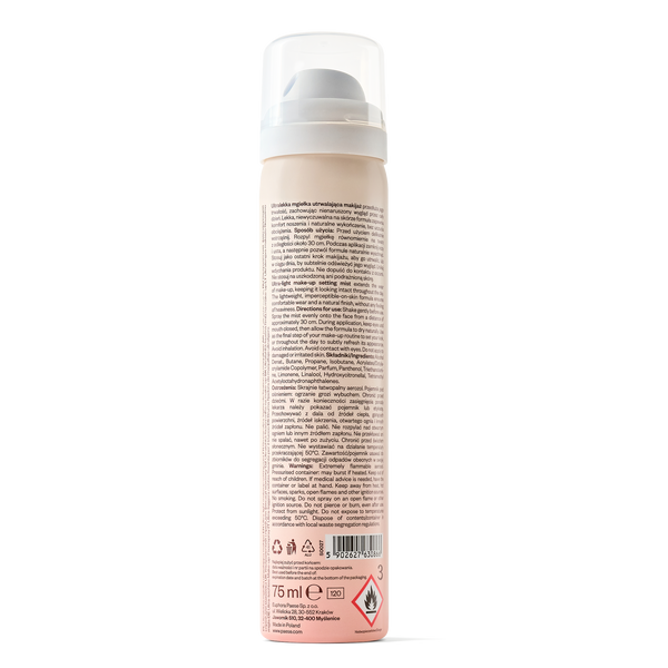 Ultralahký fixačný sprej predlžuje trvácnosť make-upu a zachováva jeho dokonalý vzhľad po celý deň. Ľahká formula, ktorú na pokožke necítiť, zaručuje príjemné nosenie a prirodzený vzhľad bez pocitu ťažkosti.